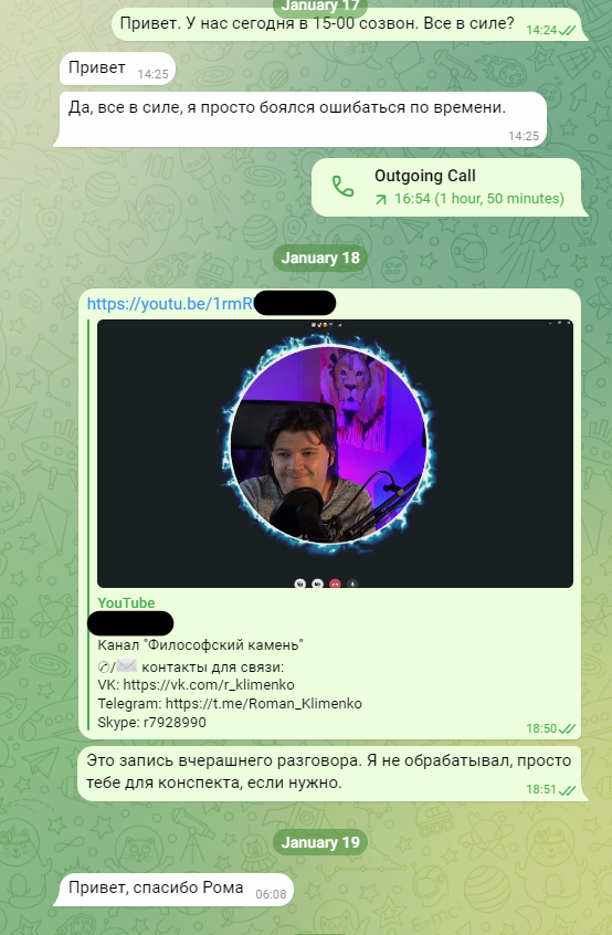 Далее ты скидываешь этот отчёт мне на разбор и проверку. Я даю тебе обратную связь, на что обратить внимание, где-то что-либо подкорректировать, либо, если всё хорошо и мы с тобой справились с этим заданием, то мы переходим к следующему заданию и таким образом шаг за шагом мы двигаемся вперёд к нашей цели - к поиску твоего предназначения. Обратную связь по каждому упражнению я даю в виде текстового сообщения, записи голосом или видеоответа, в котором я разбираю то упражнение и задание, которое ты выполнил(а). В случае необходимости мы всегда можем созвониться и пообщаться, обсудив возникший вопрос.